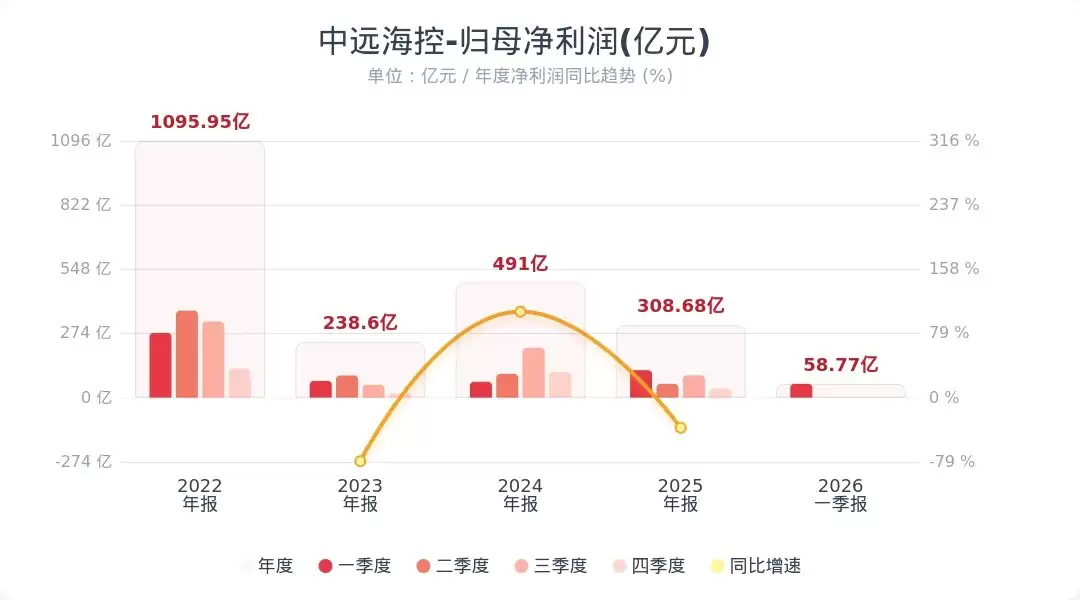 市场刚刚迎来一份备受关注的财报。中远海控发布的2026年第一季度报告显示,公司当期实现营业收入517.97亿元,与去年同期相比,下降了10.63%。更受关注的利润指标方面,归属于上市公司股东的净利润为58.77亿元,同比降幅达到49.75%。