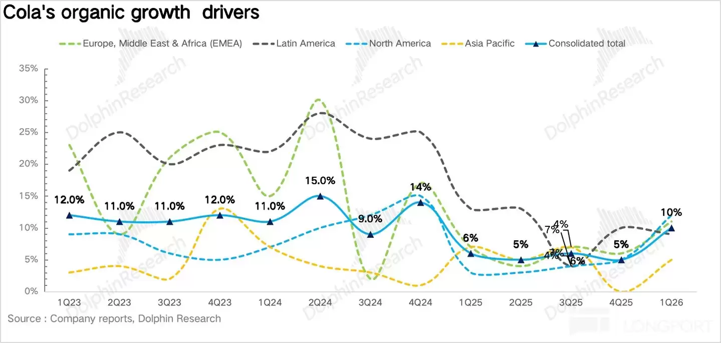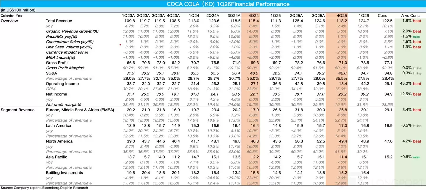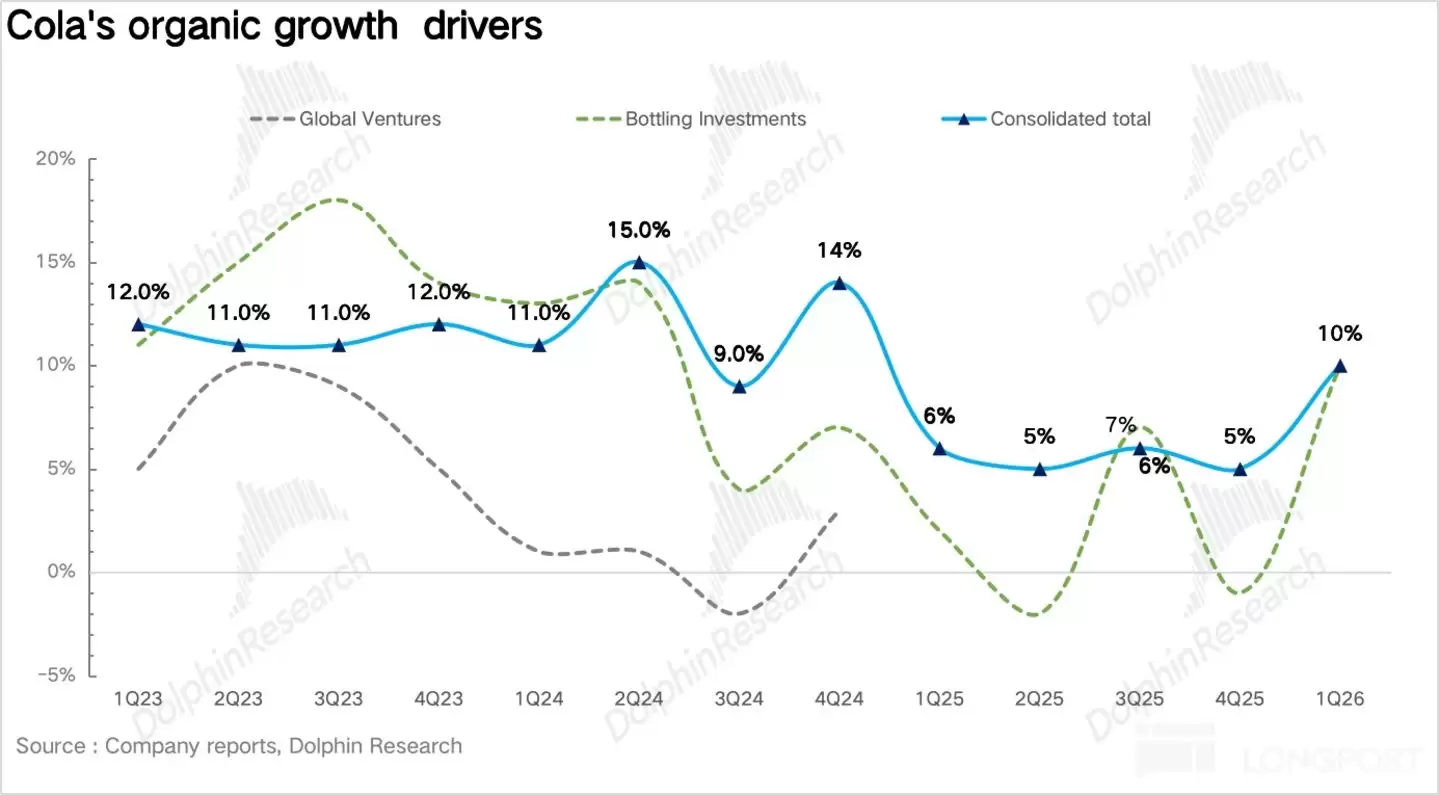 单看财务数据,10%的有机增长和18%的EPS增长,对于可口可乐这样体量的成熟巨头而言,无疑是一份出色的“开门红”答卷。但跳出数字,这份财报更传递出两个关键信号: