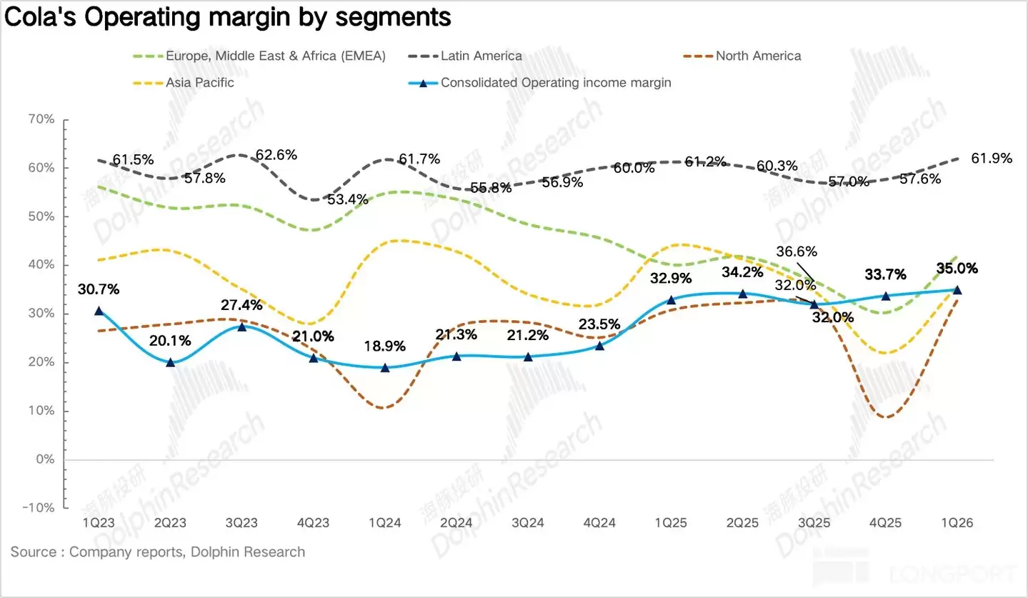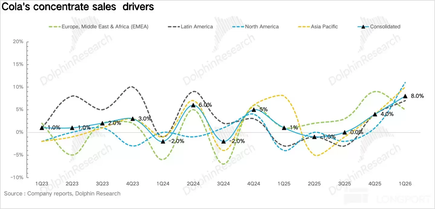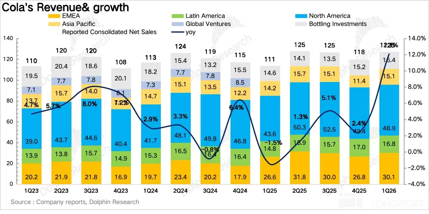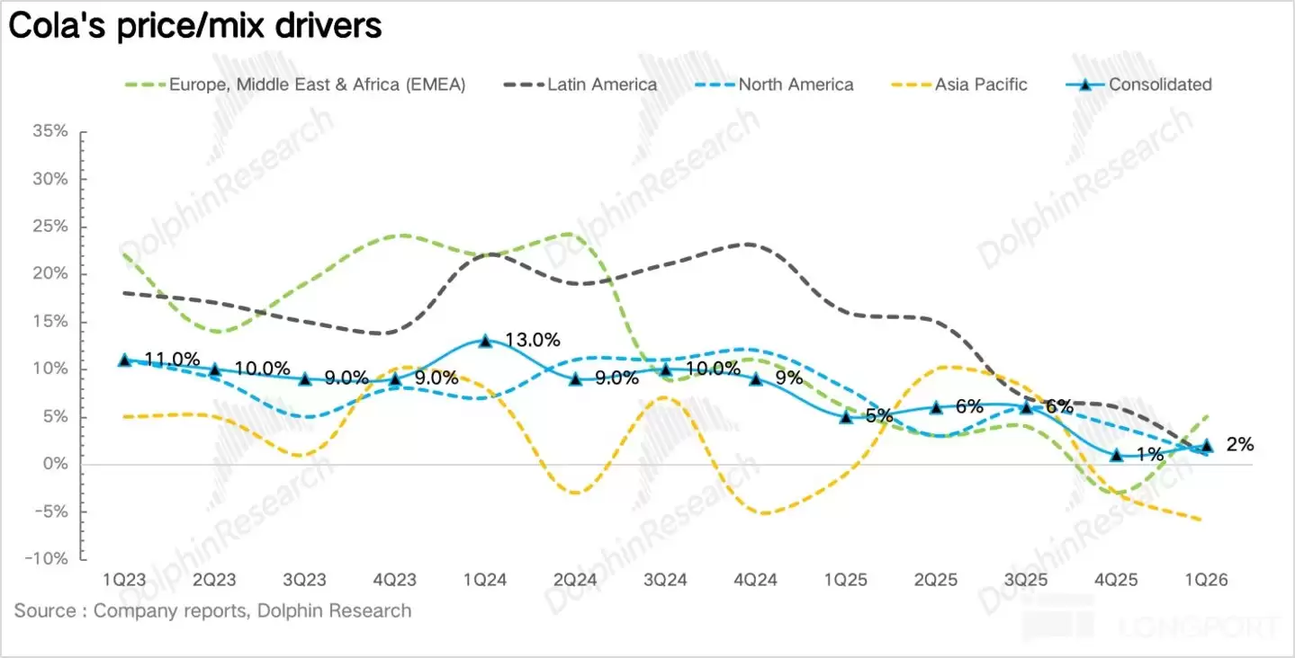 拉美市场增长14%,表现亮眼。但更引人注目的是其平稳度过了一次政策冲击:墨西哥自2026年1月起大幅提升了含糖饮料税,并对零糖饮料新征税负。完全对冲税负大约需要提价10%,但凭借强大的渠道掌控力,可口可乐通过与装瓶商伙伴的协作,顺利完成了价格传导,市场表现稳健。