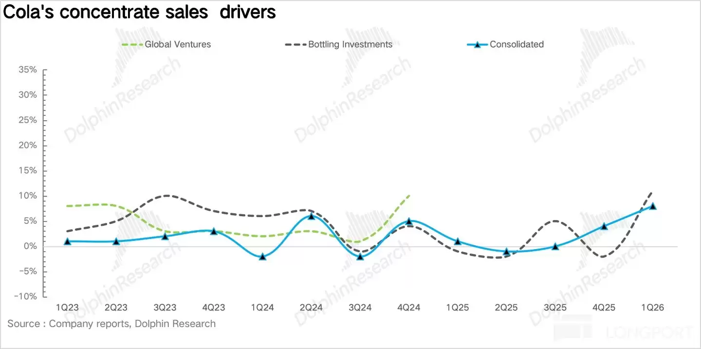 先看整体表现:一季度,公司实现表观营收124.7亿美元,同比增长12%。更值得关注的是内生营收增长高达10%,这剔除了收购和汇率的影响,反映了真实的业务动能。拆开来看,增长主要来自两方面:浓缩液销量增长了8%,而价格与产品组合优化贡献了另外2%。