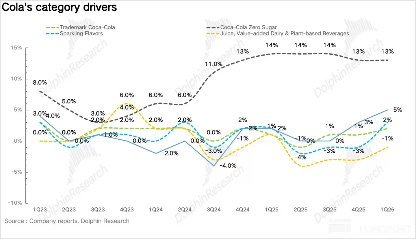 全球减糖的风潮,在财报数据上得到了最直接的印证。碳酸饮料中,零糖产品继续保持双位数(13%)的高速增长,势头不减。这已经不是趋势,而是确定的消费转向。