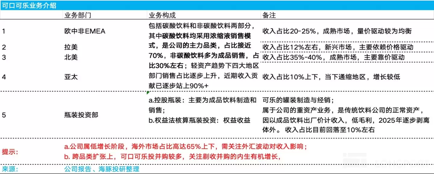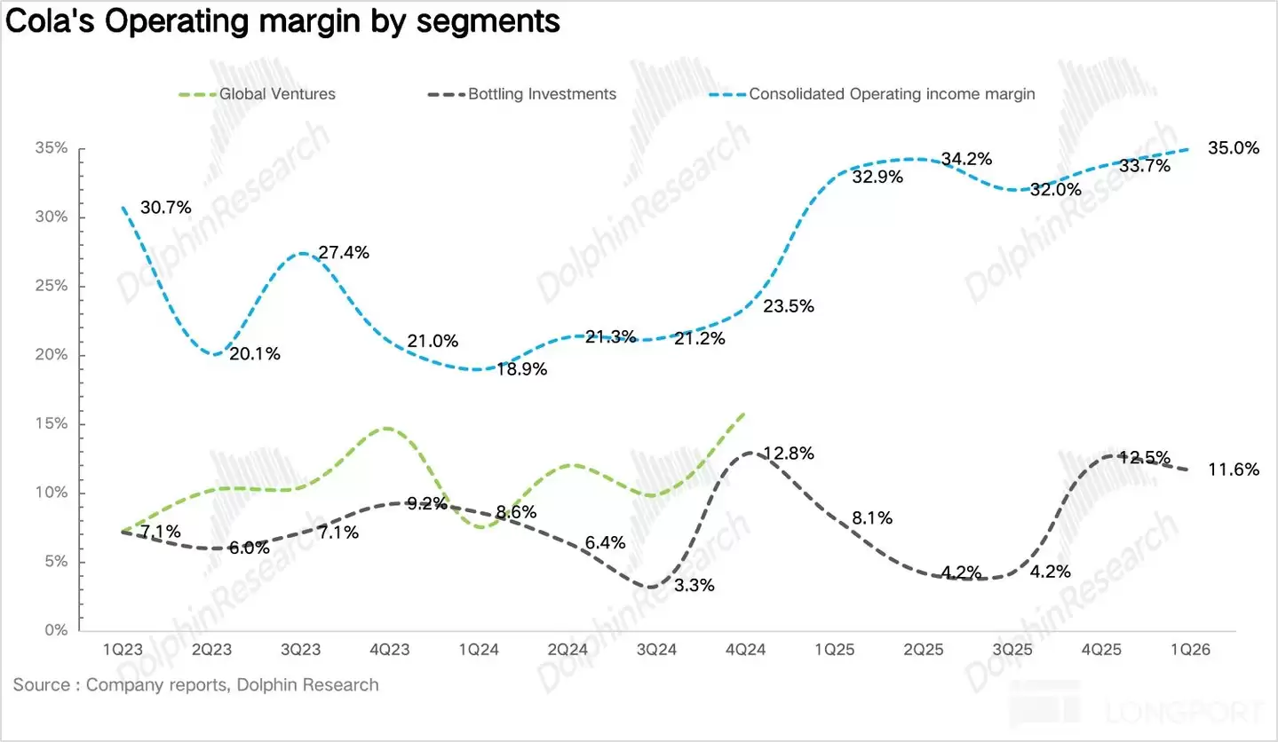 其中,碳酸饮料(约占70%)主要采用浓缩液销售模式,是利润核心;非碳酸饮料(约占30%)多为成品销售。而瓶装投资部门作为重资产业务,盈利能力较低,公司已持续多年进行剥离,以优化资产结构。