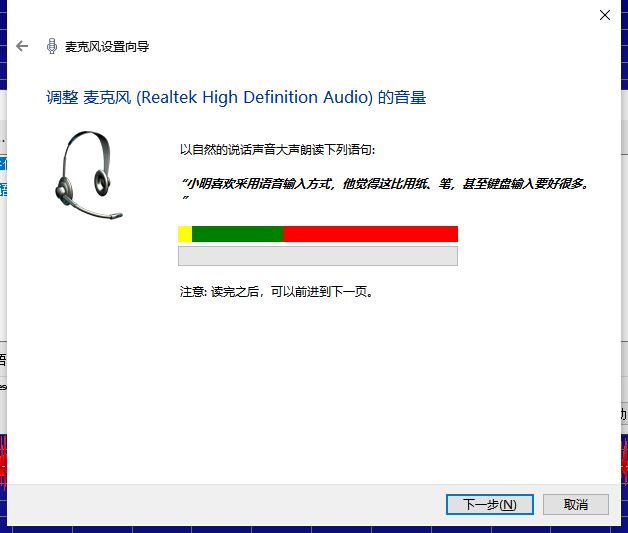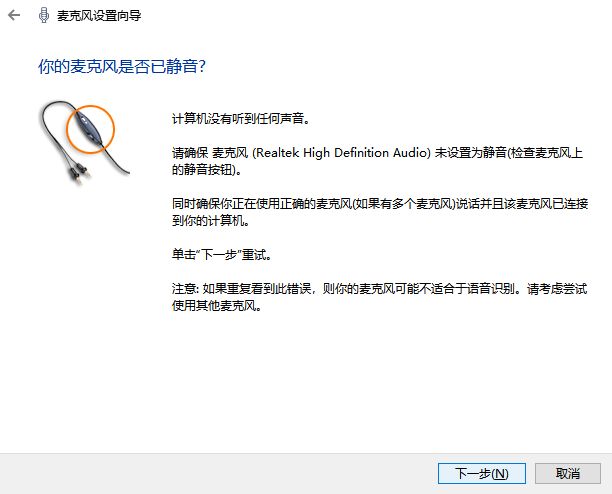 图七提示,小编的麦克风没有声音,可能是麦克风坏了。点击下一步,会回到图六步骤,测试麦克风环节。