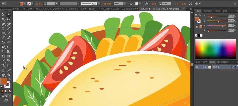 第一步,用钢笔工具勾勒出鸡肉卷的整体轮廓。这一步需要特别注意层次感的呈现:外层的面饼、内层的蔬菜叶、肉块和番茄片都要分别绘制路径。最后别忘了左侧那个点睛之笔——大辣椒的细节路径。