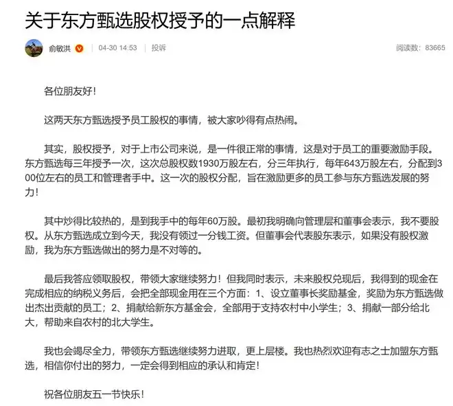 4月30日,新东方创始人俞敏洪通过个人微博,就近期备受关注的东方甄选股权激励事项作出了详细说明。核心信息很明确:他个人所获得的激励股份,未来兑现后,资金将全部用于设立员工奖励基金及公益捐赠,一分不留。