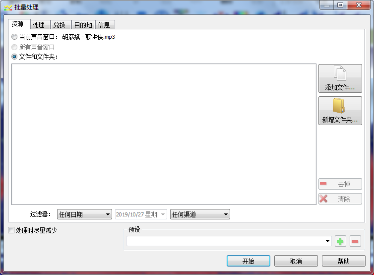 简单总结,GoldWave中文版批量操作非常硬核,在批量设置“均衡器”时,其可选择的效果为“均衡器”设置面板“预设”下拉框中的默认效果。首先通过批量处理设置面板“资源”选择音频所在文件夹,通过“处理”添加“效果”,再通过“兑换”和“目的地”分别设置,文件处理后文件格式及储存位置,点击“开始”,即开始批量处理音频文件。
