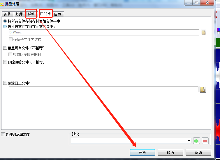 通过图五中标记的“兑换”和“目的地”按钮,分别设置效果处理后的格式及保存位置。点击下方“开始”按钮,GoldWave中文版便可开始工作了。