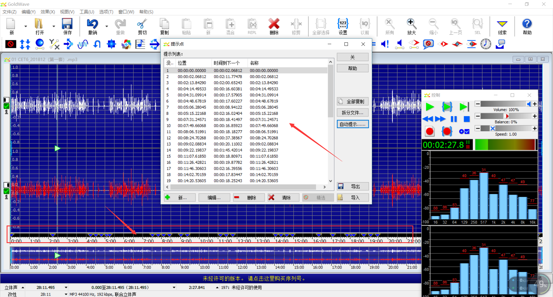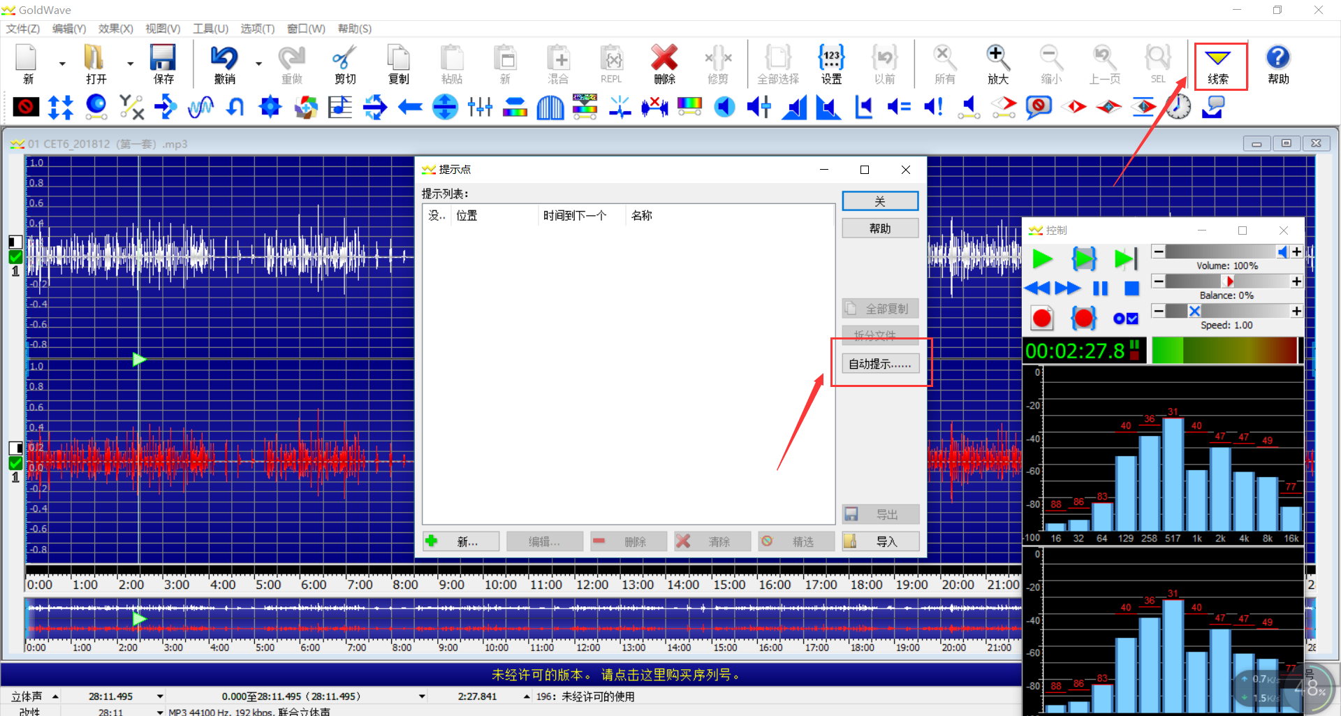 但是肯定会有人觉得太麻烦,心里想,这样搞下去我还不如直接拉进度条来的快。别急嘛,其实这个过程是可以偷下懒的。贴心的GoldWave开发者们估计也想到了大家的需求,在找标记点时加入了自动提示功能。点击工具栏中的线索,就会弹出一个提示点的对话框,你找的提示点都会在这里列出来。看到对话框右侧的自动提示按钮了吗,直接点它。
