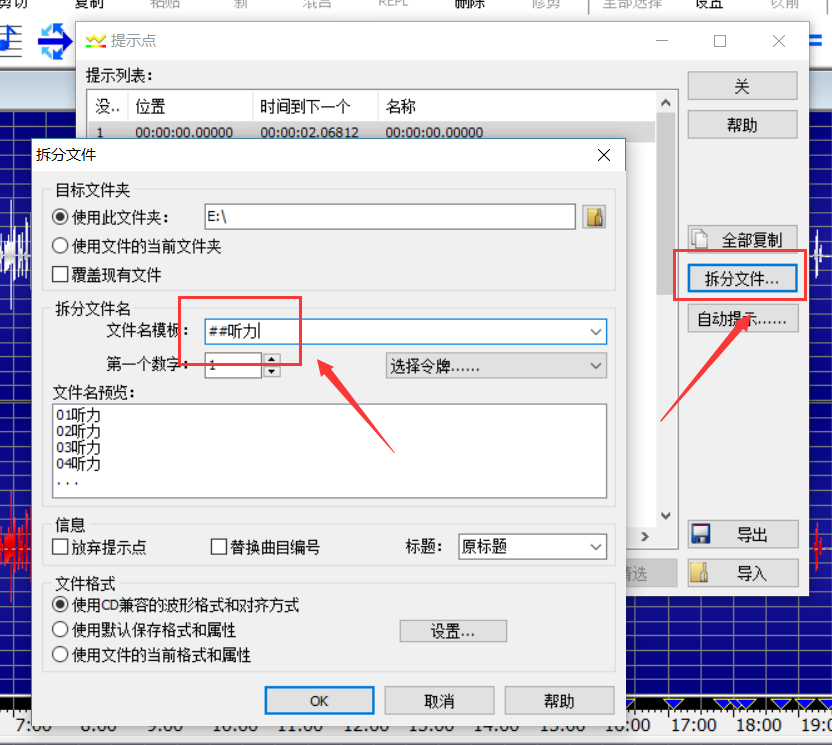 第三步,我们就得对标记的静音点进行甄选了,哪些才能作为我们的音频分割点呢?由于英语听力形式规范,我们很容易能找到规律,在两个距离较远的标记点之间,是读题干或者就是我们需要的每道题的听力原文,而密集排列的四个或者五个标记点就是每段听力下面的小题读题时间。不信的同学可以听听试试哦。