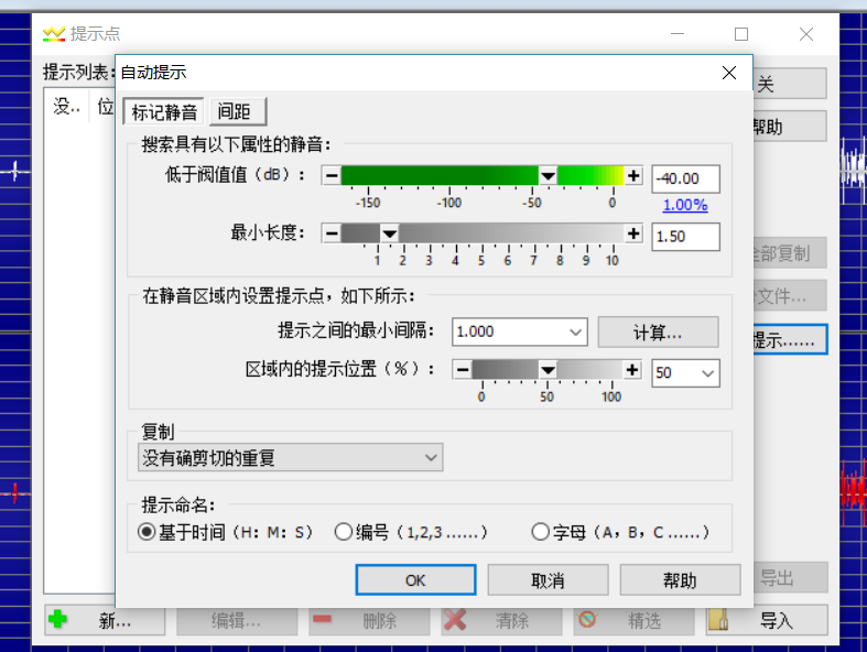 然后可以选择进行提示的标准,这里可以在静音处添加标记点,也可以按距离进行分割。做过英语听力的小伙伴都知道,在英语听力中,每一道题都会在开始的时候有几秒钟的停顿。所以这里我们直接标记静音就行了,然后点击“OK”。