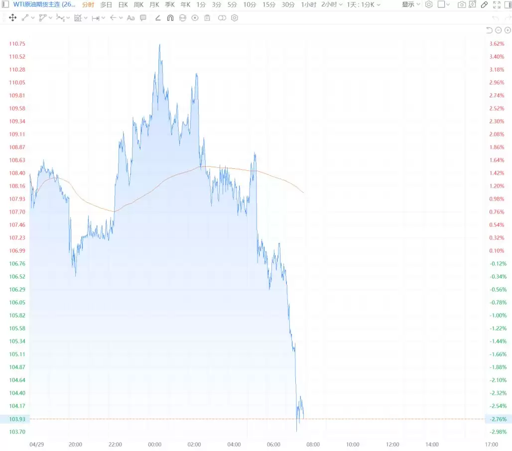 市场刚刚经历了一次显著的波动。北京时间4月30日,国际油价盘中跌幅迅速扩大。截至发稿,WTI原油期货价格下跌超过3%,报103.613美元/桶;布伦特原油期货价格同样跌去3%,报107.122美元/桶。这一波下行,让此前因紧张局势而紧绷的市场神经,似乎有了些许松动的迹象。