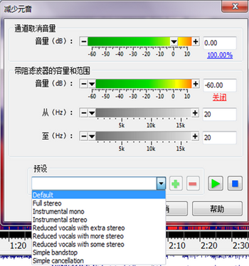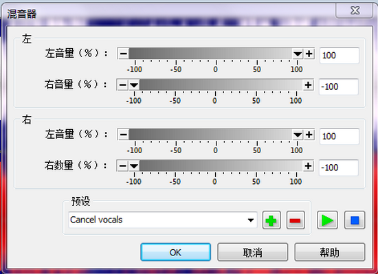 将混音器中左声道的左音量调节为100%,将右音量调节为-100%,右声道按照同样的参数调节,然后预设中选择“cancel vocals”,点击“OK”即可消除人声。