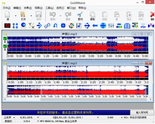 打开Goldwave 中文版后,直接将要收集好的音频导入软件内,在这里我导入了两个音频(如图2),拿两个来做示范,如果你需要用多个音频做混音,其实处理步骤是一样的。