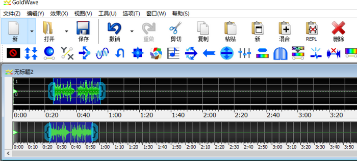 这时我们可以看到我们所需要的音乐片段已经被我们设置成高亮部分,之后我们在主菜单选择“剪切”,再单击“新”这样就打开一个新文件了,打开一个新的文件后将音乐“粘贴”在上面,此时我们就可以看到我们所选的音乐片段就出现在新的文件上了。