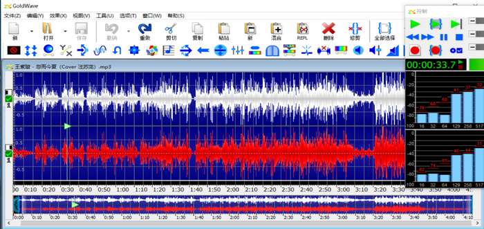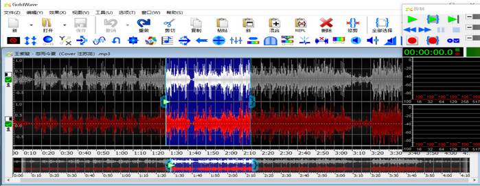 导入完成后我们可以看到GoldWave软件已经将整个歌曲绘制成为波形,我们再单击右边控制面板上的“开始“按钮,这时我们就可以播放整首歌曲了。