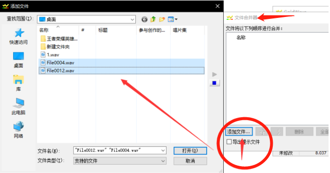 其次就会弹出一个文件合并器的对话框,我们点击【添加文件】,找到音频所在的位置,再按住Ctrl,然后用鼠标选中多个你要添加的音频文件,再点击【打开】,这些音频就置入了GoldWave中。
