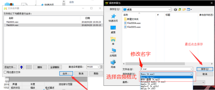 最后我们确认无误后,就可以点击【合并】了,然后GoldWave就会帮你将音频合并好。再选择文件格式,一般都为mp3格式,当然根据你的需要和用途进行选择,还可以修改名称,选择保存路径。