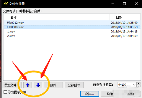 然后我们可以根据自己的需要用鼠标拖动文件,按照你需要的顺序从上而下排好,当然在GoldWave总还可以点击文件然后通过点击上下键来对顺序进行调整。一定要按照你想要的顺序排好,这个顺序会决定了合并后的播放顺序。