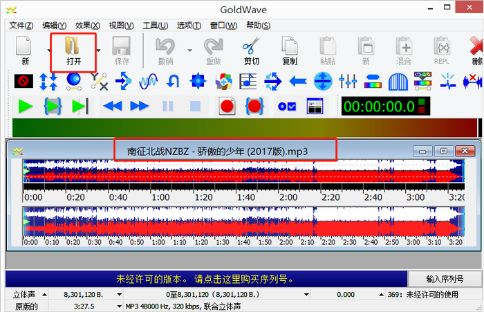 打开Goldwave中文版后,紧接着将下载好的《骄傲的少年》导进来(如图2)。