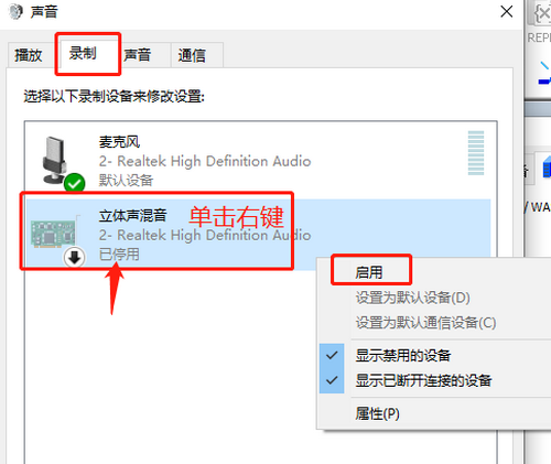 点击“配置”后,我们在打开的新窗口可以查看录制设备的情况,在“录制”选项卡里,留意一下是否有开启“立体声混音”。如果没有开启的话,我们要单击右键,将其启用。