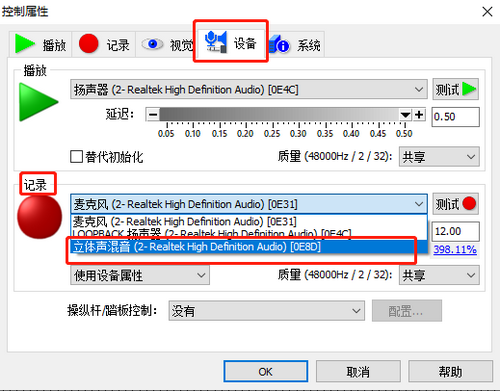 这时,我们再打开控制属性窗口中的“设备”选项卡,并在录制栏里,选中“立体声混音”,详情如下。