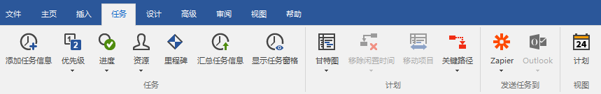 这时我们可以看到各个功能命令栏,点击任务,下面就是任务命令栏的各个功能。
