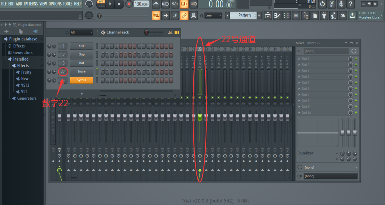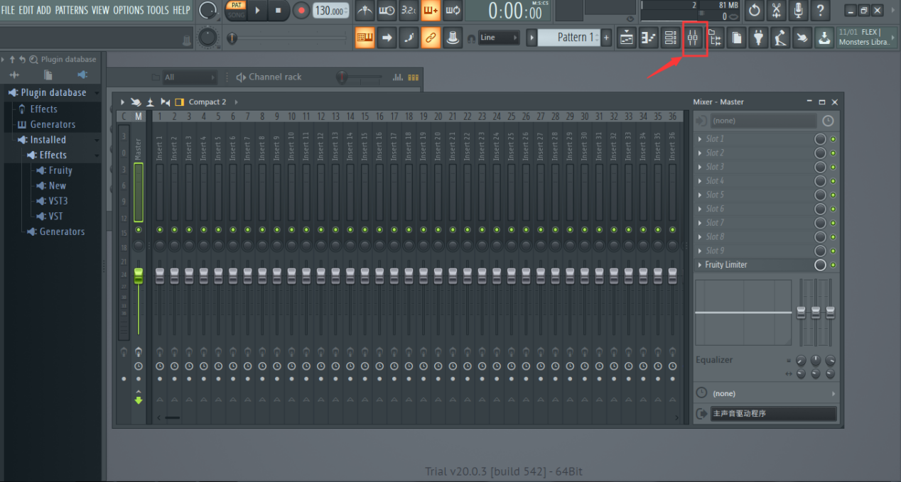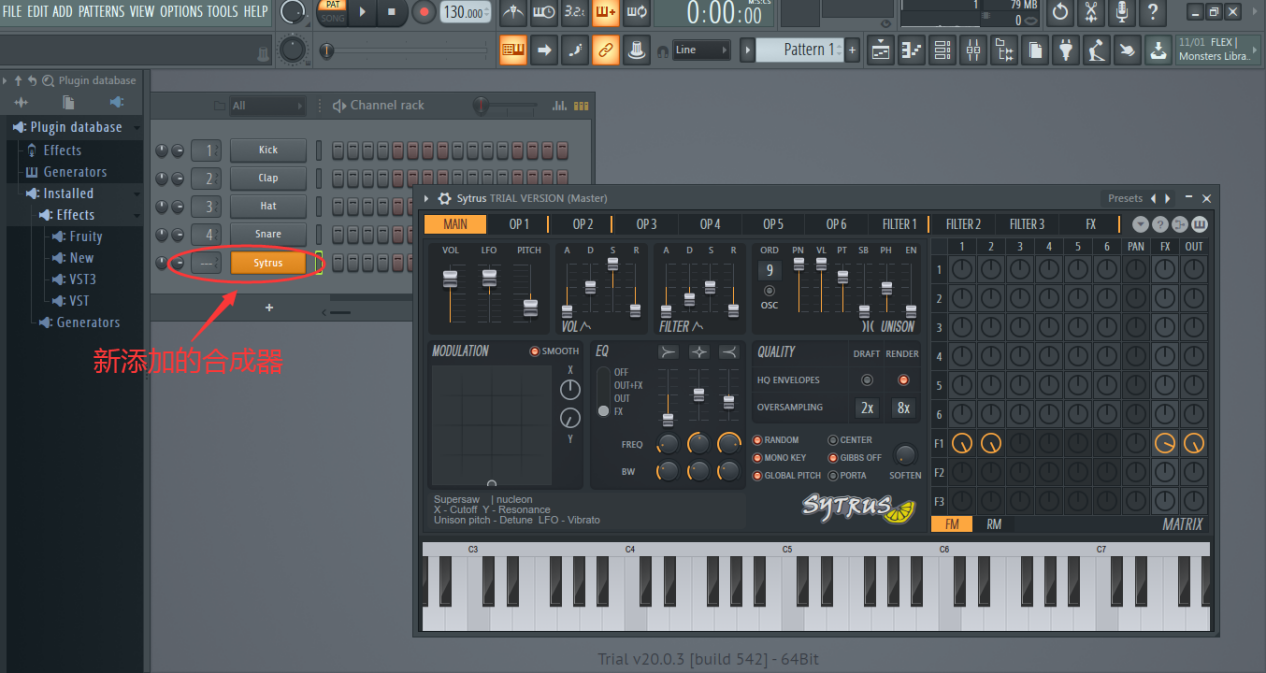 界面分为左右两部分,左边为合成器,只可添加到通道机架,右边为效果器,是添加到混音台的,拖动合成器图标到通道机架即可添加,如图: