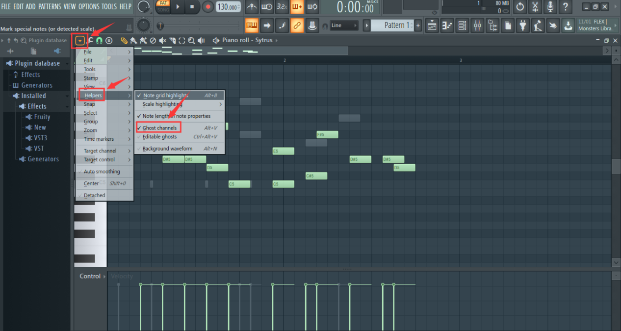 在钢琴窗中点击左键添加旋律,右键删除,旋律对应的是通道机架中的合成器,可以看到图中音符有的暗有的亮,这是最佳状态,所有音符一目了然,点击钢琴窗左上角三角形图标,依次点击“Helpers”、“Ghost channels”即可设置,如图: