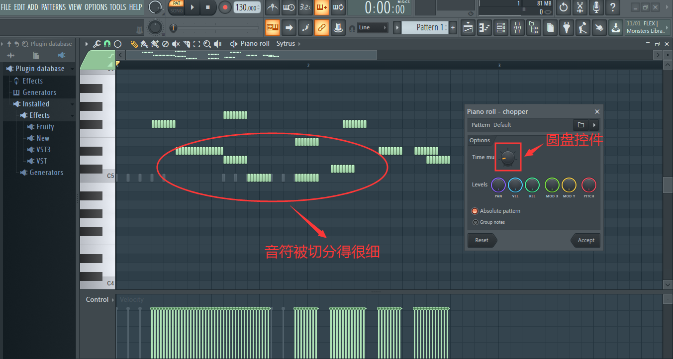 电音制作中常常用到的音符切分功能,即需要某个音符一直重复,但是要控制单个音符时长,钢琴窗中也可设置,仍然点击钢琴窗左上角三角形图标,再依次点击“Tools”、“Chop”,来到调节界面,如图: