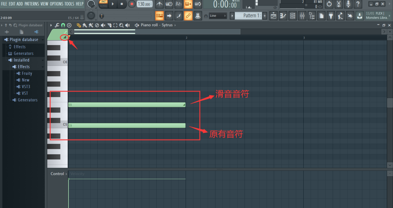 除此之外,电音制作中还经常用到的滑音效果也可在钢琴窗中添加,点击钢琴窗左上角的两个滑音图标,如图: