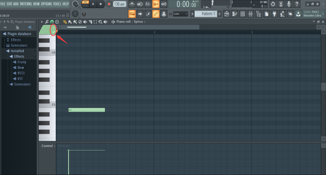 在音乐编曲软件FL Studio中添加完合成器后,需要在钢琴卷帘中创作旋律(以下统称钢琴窗),点击通道机架右上角图标进入钢琴窗,如图: