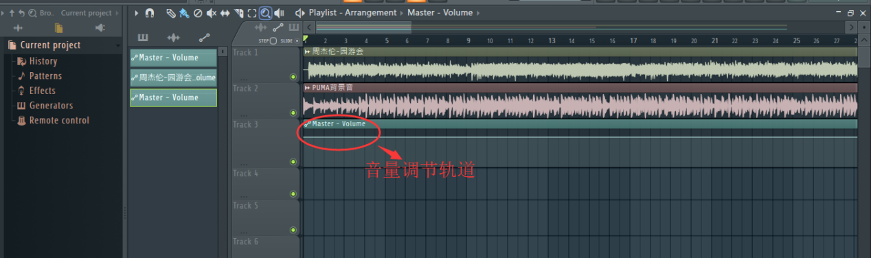 在音量轨道上单击右键会生成两个圆点,大的是调节整体音量的,小的是在前后两个大圆点之间微调,如图: