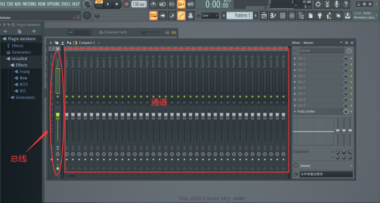 混音台中最左端为总线,右边所有的通道都会将声音发送到总线进行处理,如图: