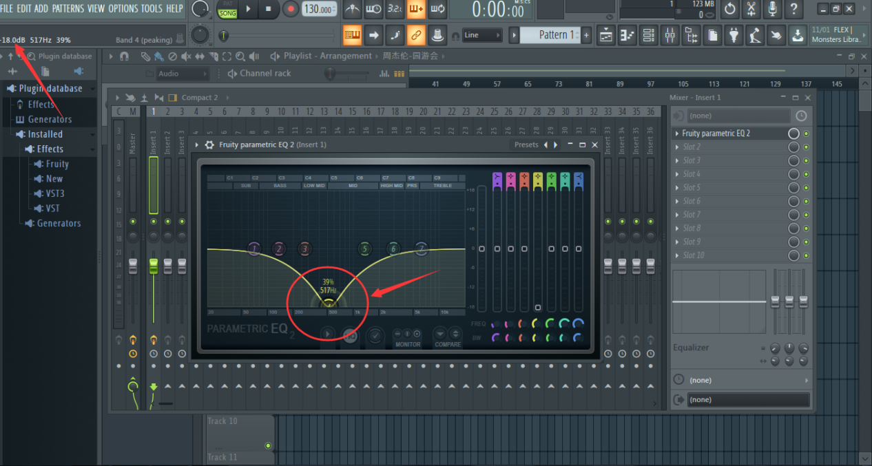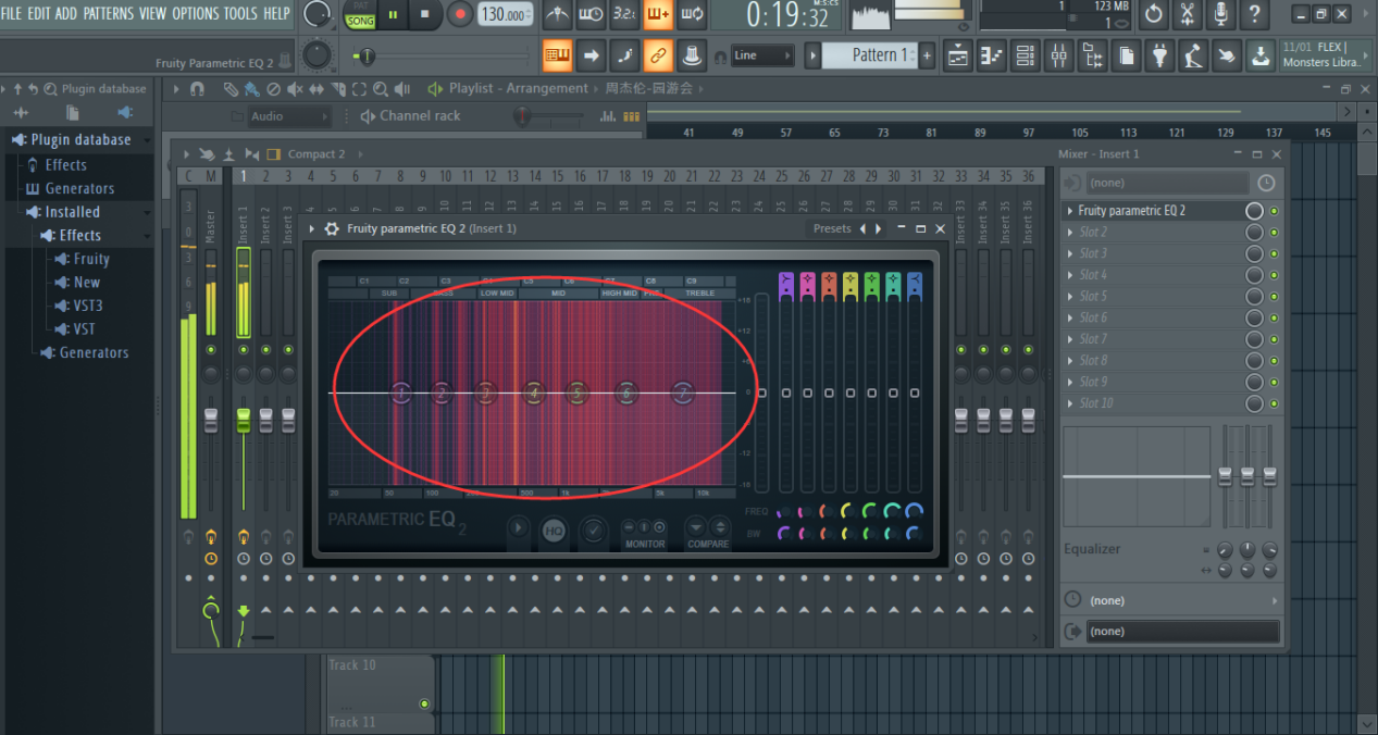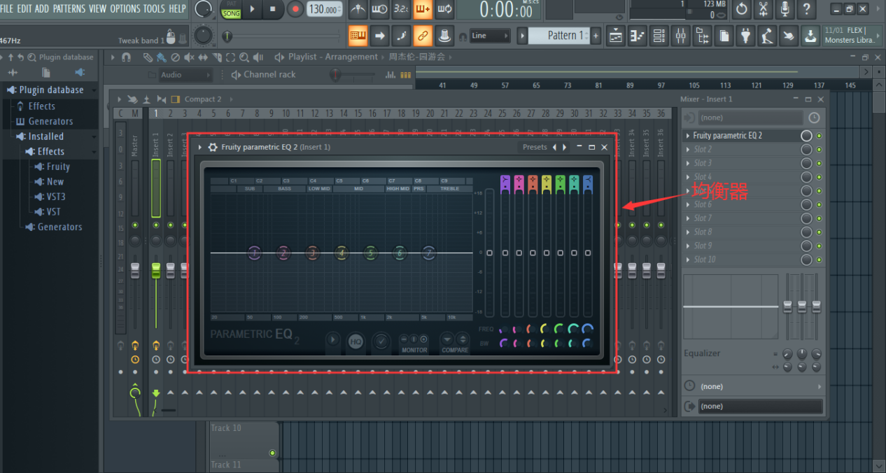 声音是有频率的,频率越低就越沉闷,反之越尖锐,当我们需要调节某段旋律的音高时,就需要用到均衡器,点击混音台右端的Slot,选择“Fruity Parametric EQ 2”,来到均衡器界面,如图: