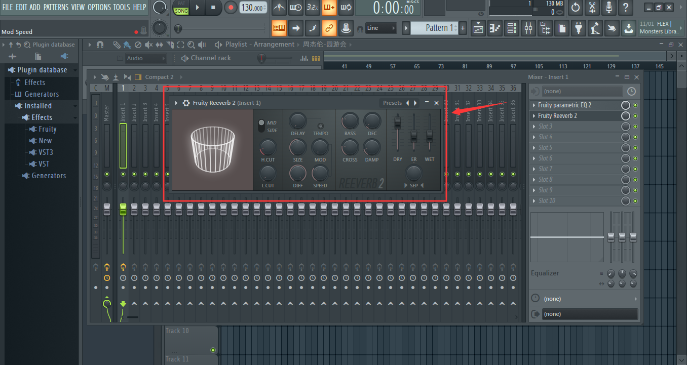 点击Slot,选择“Fruity Reeverb 2”,来到混响界面,如图: