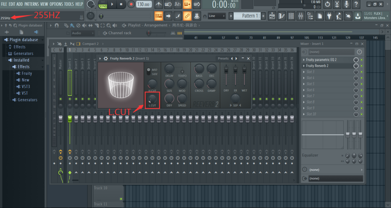 在混响中也需要对声音的频段进行限制,所以混响界面中的“L.CUT”为低切,即切低频,“H.CUT”为高切,为切高频,“L.CUT”一般调至250HZ-300HZ即可,高切根据实际情况而定,跟前文所讲的EQ均衡器原理相似,都是控制频率,如图: