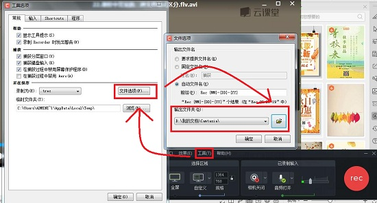 而我们源文件保存的位置一般都是默认生成在选择的文件夹,如果想要改变默认生成文件地址,我们可以在Camtasia Recorder界面的工具→选项→文件选项→输出文件夹中修改。