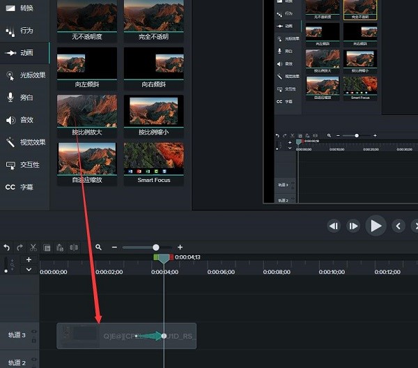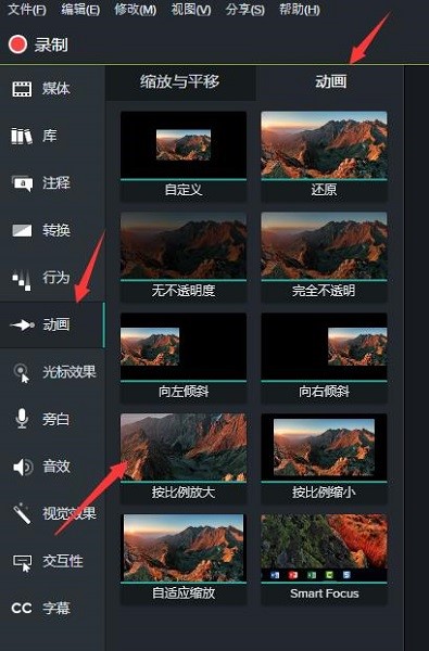 2 在Camtasia 中我们要实现视频细节调整的功能,就需要用到动画功能。点击软件界面的“动画”按钮后会呈现出几种动画样式。例如按比例放大缩小、自动调整细节的放大与缩小、智能聚焦等等。在这里我们选择按比例放大。