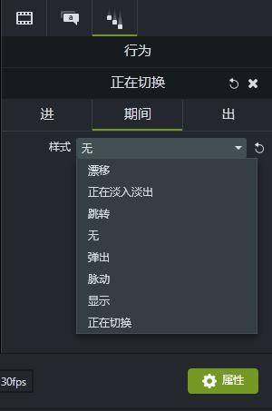 这时我们需要对矩形和圆1设置一个动画使它们动起来。我们可以在行为功能中找到“正在切换”动画,并将它分别拖放到矩形和圆1的时间轴上。这样这两个图案就给人一种从上方“掉下来”的错觉。