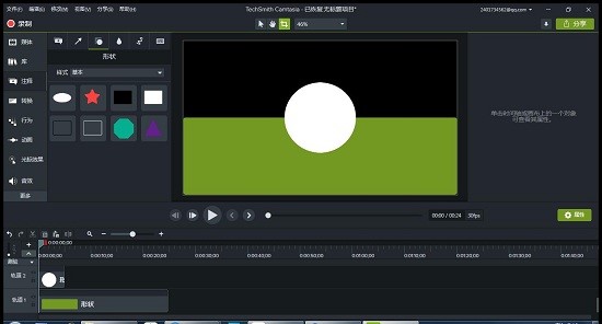 然后再拉取一个圆形(称为圆1)放到界面正中间。然后将矩形和圆1的轮廓分别调至与各自图形相同的颜色。注意,这里的圆1和矩形不在同一条时间轴轨道上。