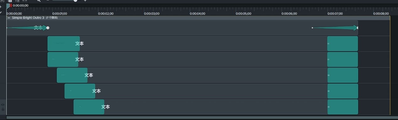 我们添加“片尾”中的“simple bright outro 3”效果。将效果拖入我们的轨道中,画面上就会出现如上图图二所显示的样子,轨道2中和画面上的文字就是我们的预设。