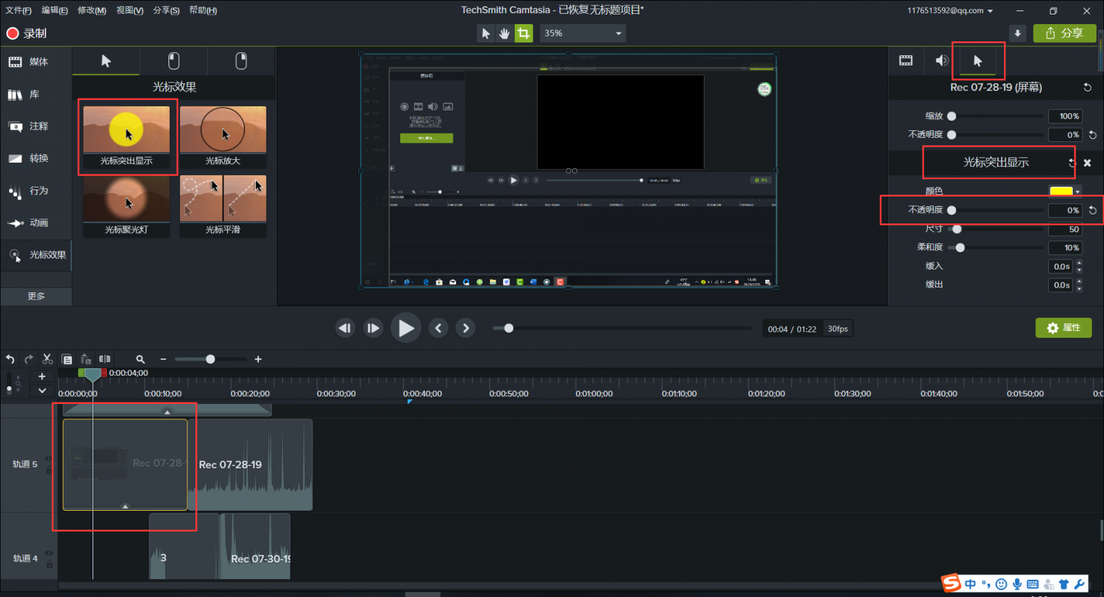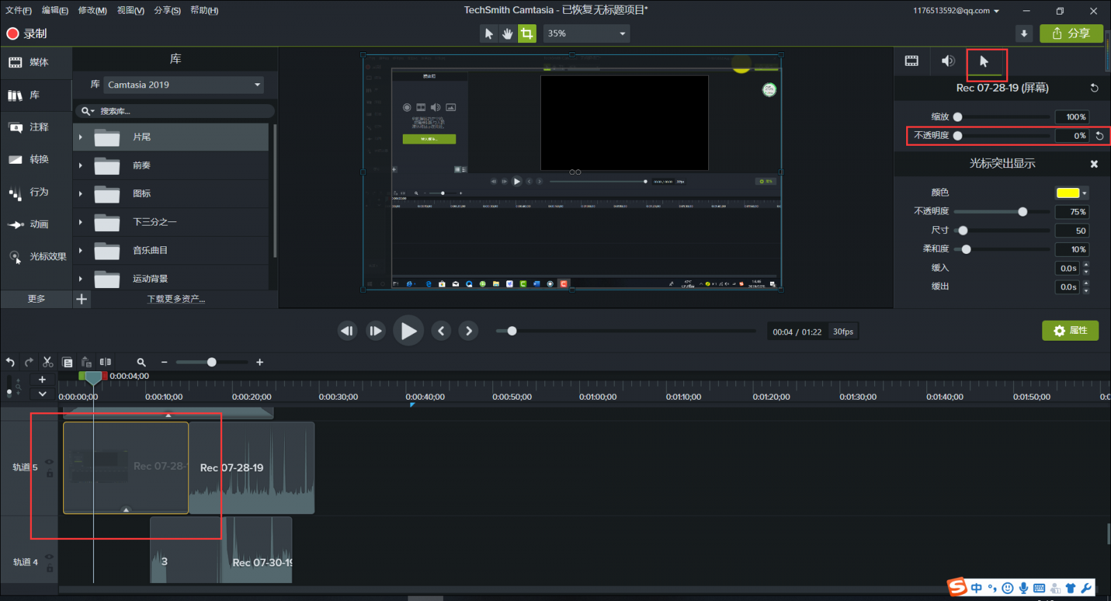 如果我们想要让光标只是隐藏一段时间,就选择任意光标效果,拖到时间轴上的媒体中,在“属性”栏里把“光标效果”的“不透明度”改为0,然后再调整时间轴上光标效果的持续时间就可将光标隐藏一段时间。