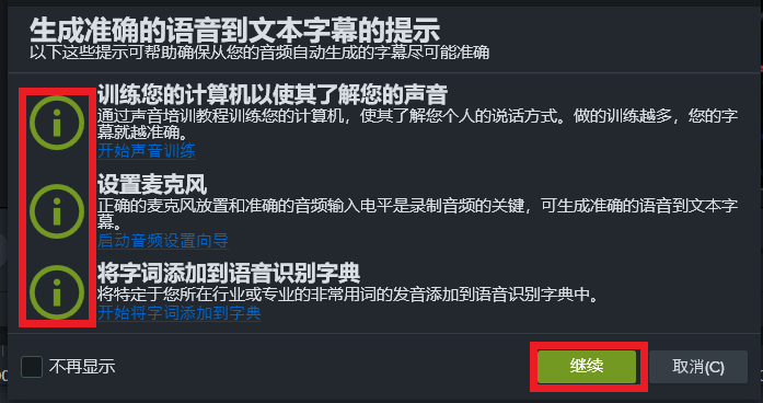 在这里Camtasia会弹出一个关于语音到文本的提示,第一步进行声音训练,然后设置麦克风,最后将字词添加到字典,将这三个设置完成之后,点击“继续”,开始音频的转录。