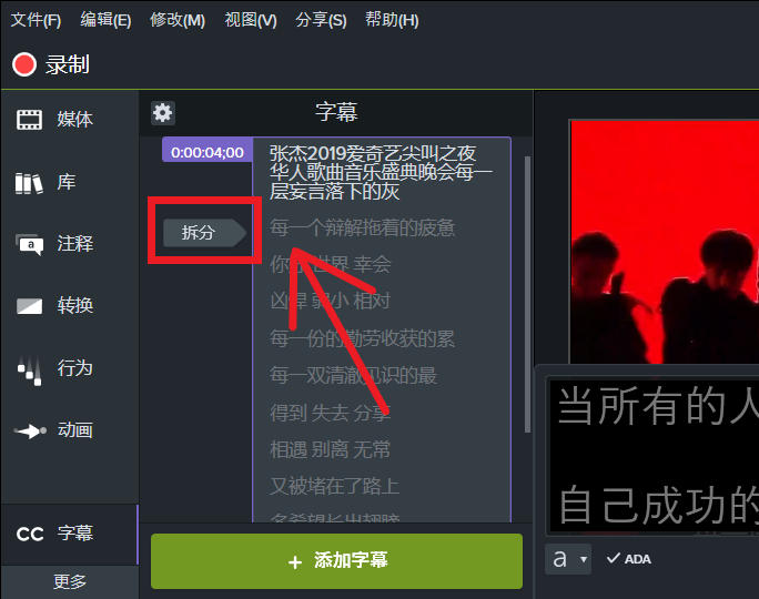 最后,在左侧的字幕框里,输入的字幕会以整段的形式出现。如果想要实现字幕与视频的同步,还需要进行一个拆分操作。可以一边播放视频,一边进行字幕的拆分的操作,在视频的过程中,可以根据语音的停顿及画面的转换,在每句话开头的时候点击拆分。在整段视频播放完成之后,拆分操作也进行完成了,只需要再播放一次视频进行细节的修改就可以了。