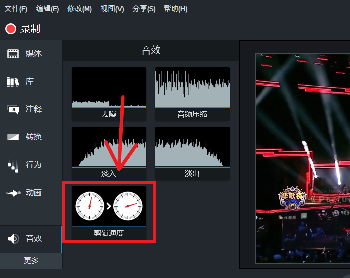 其次,在Camtasia中录入字幕的时候,可能会出现视频音频播放速度太快,导致手工输入字幕速度跟不上视频播放速度的情况,所以,需要调整视频的播放速率。找到“音效”中的“剪辑速度”,拖动其到视频中,在“属性”中设置播放速率,可以根据个人习惯设置不同的速度。
