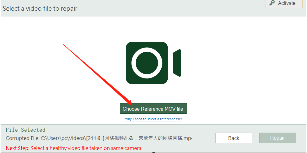 3.点击打开按钮之后我们需要修复的视频就成功添加到界面中了,接着下一步是点击界面中的“Choose Reference MOV file”这个按钮。