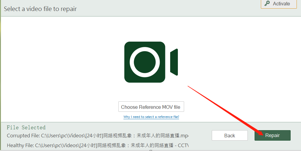 5.选择好修复视频的参考文件之后,我们只需要点击界面右下角的Repair这个按钮就可以开始修复视频的操作了。