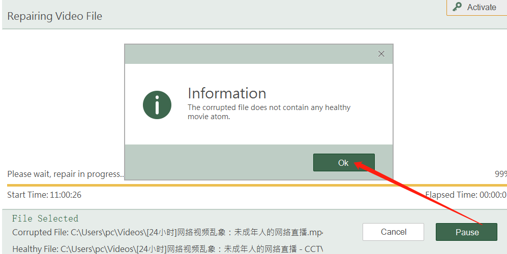 6.等到最后修复完成之后我们可以看到进度条为99%,也就是修复视频的完整度,也会出现一个修复成功的提示界面,如下图中所示。