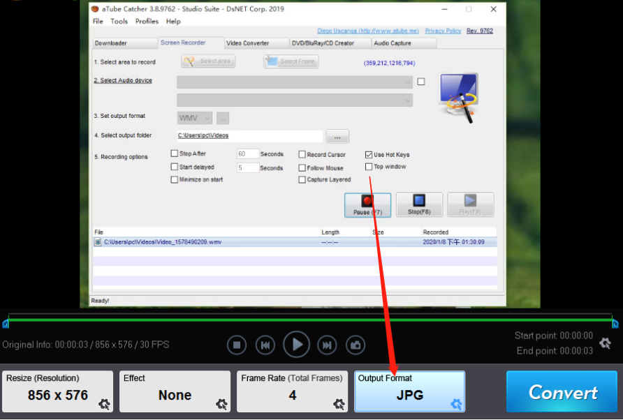 3.点击打开按钮之后视频就添加成功了,然后我们需要点击下方的JPG这个按钮,点击之后即可选择转换的图片格式。