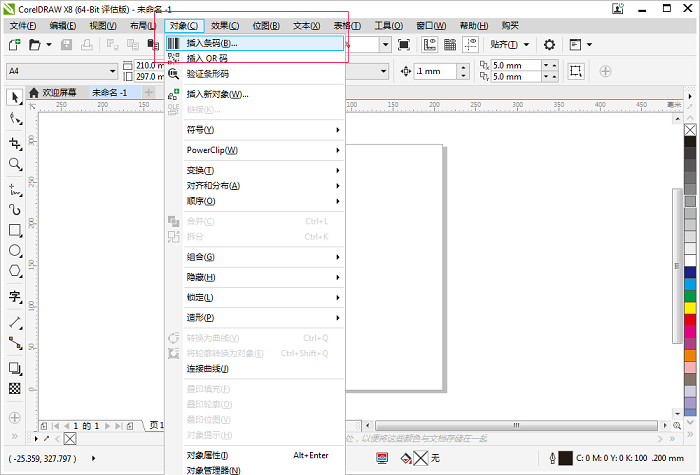 点击菜单栏的“对象”选项,在下拉列表里选中第一项“插入条码”。